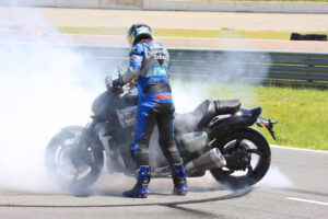 Что касается мотоциклов MotoGP, то я ездил на одном из них — Suzuki 990cc, мотоцикле Джона Хопкинса. Полноценный байк MotoGP с шинами, подвеской и всем остальным. Будучи гонщиком-испытателем и журналистом, я ездил на шоссейных байках, легких мотоциклах для езды по бездорожью или круизерах, даже на некоторых мотоциклах для мотокросса. Я ездил на них всех, проводя испытания на дороге, на треке и тесты скоростной езды с Fast Bikes, MCN и California Superbike School. Пока мне не сделали операцию с неожиданными последствиями, когда оставалось лишь 5% шанса на выживание. НО (!)по-прежнему имея половину мозга, я смог обучить нескольких чемпионов мира, Европы и Великобритании.