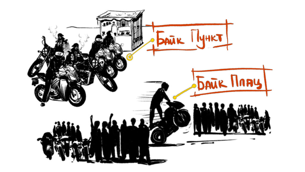 Рядом с байк-плацем может быть и некая административная часть: несколько баров и столов на открытом воздухе, чтобы в перерывах между «кульбитами» можно было где-то посидеть и перекусить. Но основное назначение байк-плаца, конечно, иное – площадка, где отрабатываются и демонстрируются особые приёмы управления мотоциклом.