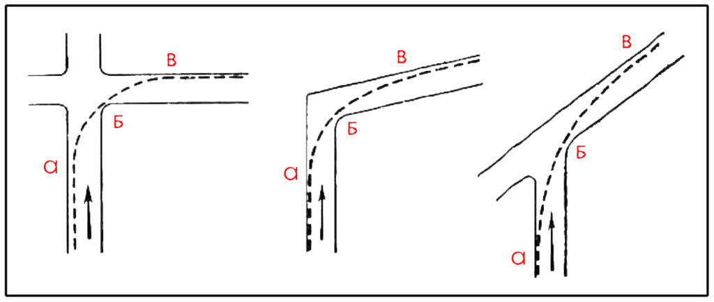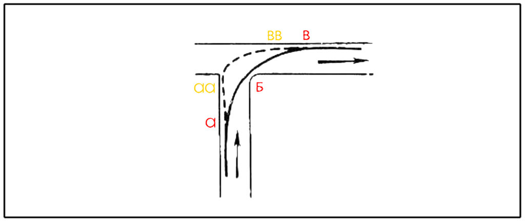 - Выбор траектории движения. Поворот следует проходить по дуге с наибольшим радиусом.