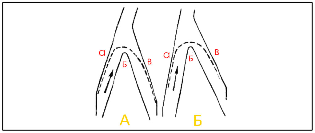 Поворот под острым углом также может быть преодолен обоими методами (рис.3). При преодолении поворота на повышенной скорости (Б) торможение закончено в точке «а», ускорение начинается на прямой в точке «в», когда мотоцикл выровнен. При прохождении поворота с умеренной скоростью (А) торможение закончено в точке «а», после чего несколько теряется скорость до точки «б», в которой вновь дается ускорение, мотоцикл еще наклонен. На таком второй метод лучше потому, что в точке «б» разница в скоростях незначительная, но зато выигрывается время, затрачиваемое на прохождение пути от точки «б» до точки «в». При пользовании вторым методом требуется особенно высокая квалификация гонщика.