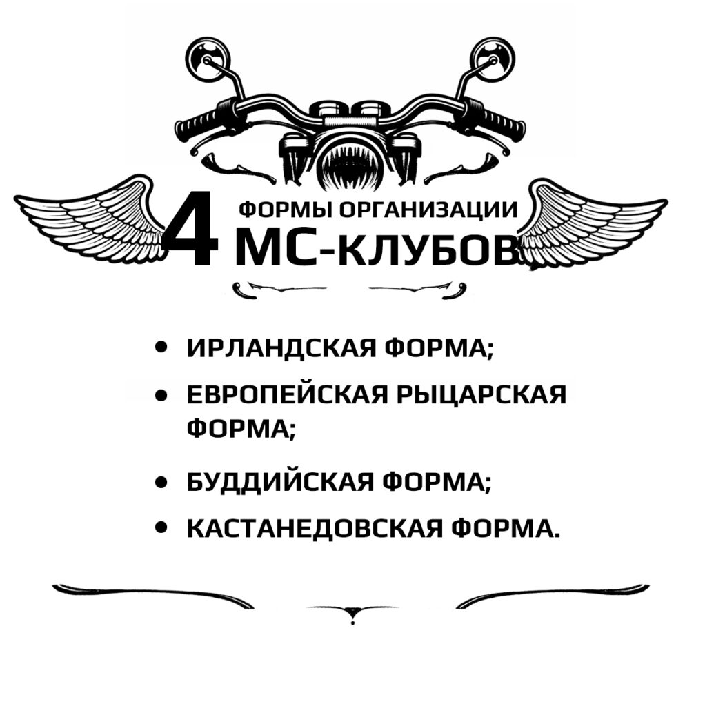 На самом деле, МС клубы бывают 4-х видов, и центральной формой каждого из видов, вокруг которой и формировалась вся система, является некая мифологическая составляющая. История о возникновении МС-клубов, которую мы рассказали выше, является лишь одной из 4-х форм, а именно — ирландской формой организации МС-клуба. Да, именно по такому принципу создалась ИРА (Ирландская республиканская армия). Но есть еще европейская рыцарская форма организации МС-клуба, существует буддийская форма организации МС-клуба, и существует кастанедовская форма организации. Всего 4 истока. И будет не верным сказать, что МС-клубы Америки организовались только по ирландскому принципу ИРА и что других форм не существует.