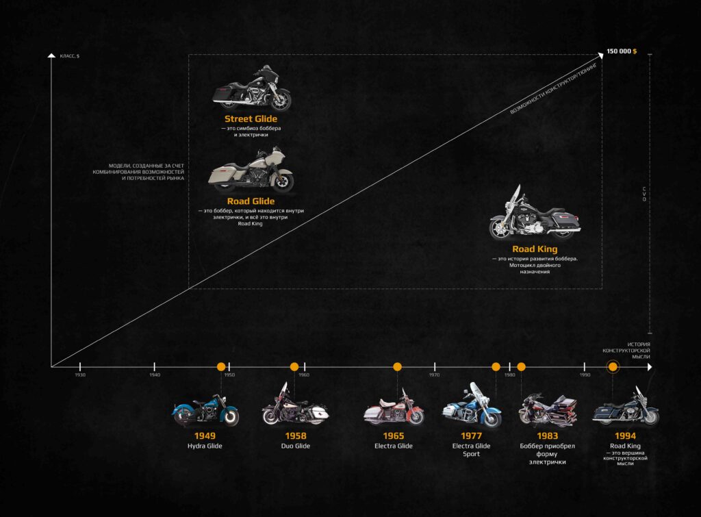 У Харлей-Дэвидсон есть модели, которые являются естественным продолжением конструкторской мысли, а есть модели, которые являются результатом конструирования под конкретные типы возможностей и необходимостей. Когда мы говорим о таких моделях как Road Glide и Street Glide, то это сконструированные, то есть собранные из нескольких модели. Когда же речь идет об Electra Glide, то это поэтапная хронологическая ретрансформация боббера, то есть этот мотоцикл появился иначе в отличие от своих собратьев. Это важно понимать.