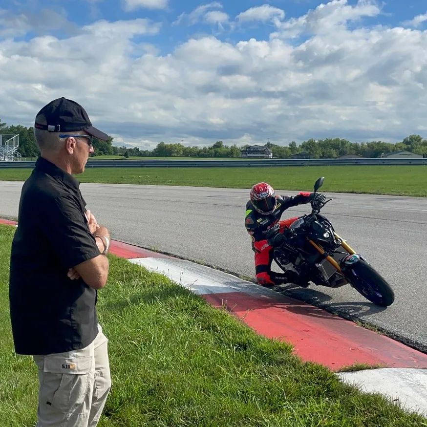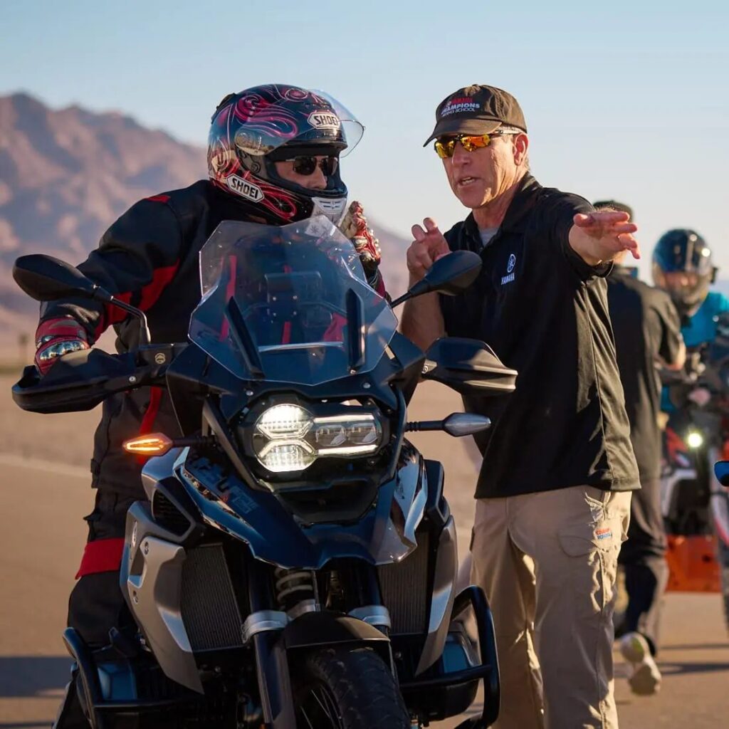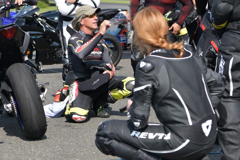 Далее, третья важная часть нашей обучающей программы – это психологическая подготовка райдера. Когда человек только начинает ездить на байке, ему важно понять всю серьезность этого. Поэтому мы объясняем райдеру, что езда на мотоцикле может привести к смерти и во избежание этого необходимо научиться быть полностью сконцентрированным. Например, Валентино Росси очень сильно наклоняется вперед и таким способом усиливает свою концентрацию. Мы рекомендуем всем ученикам нашей школы, в первую очередь стать осознанными и сконцентрированными по жизни, это и поможет их вниманию не прыгать во время езды на мотоцикле.