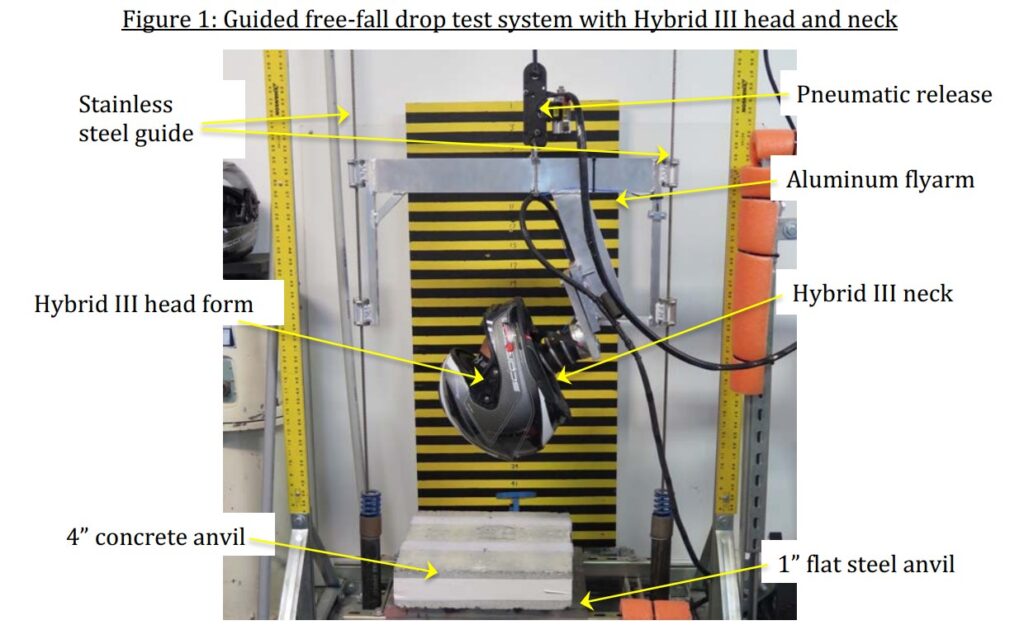 The helmets were then tested using three different test apparatuses. Firstly, a guided twin-wire drop system, which is commonly used in motorcycle helmet standards and other sports applications. This system involves twin wires guiding the helmet as it falls from a height of two to three meters onto a steel anvil or concrete base, resulting in an impact speed of between six and seven and a half meters per second (13 to 18 miles per hour).