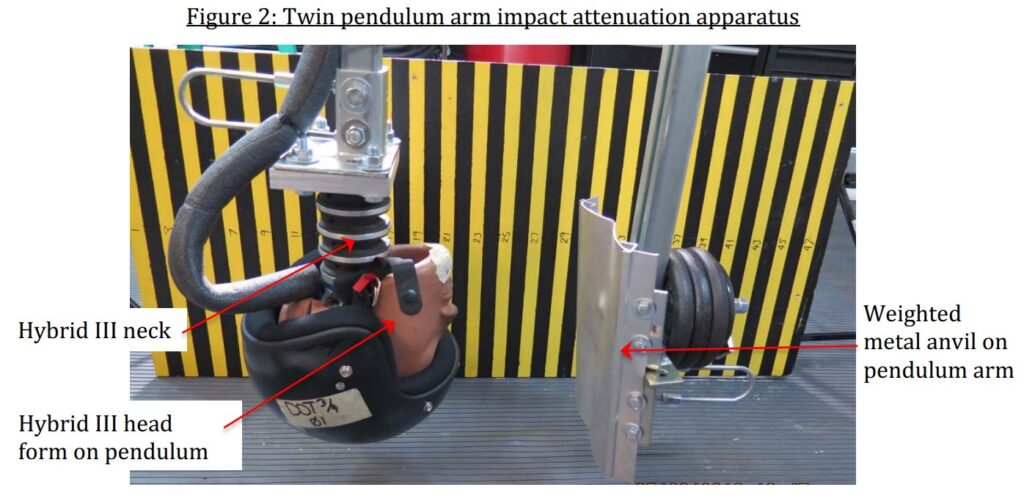 Secondly, an inverted pendulum apparatus, where the pendulum falls through 90 degrees with the helmet on a head and neck at the end. This generates a higher impact speed due to the arc of the fall, allowing for testing at speeds of up to 20 miles per hour (8.5 meters per second).